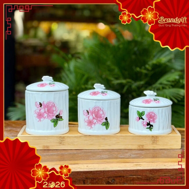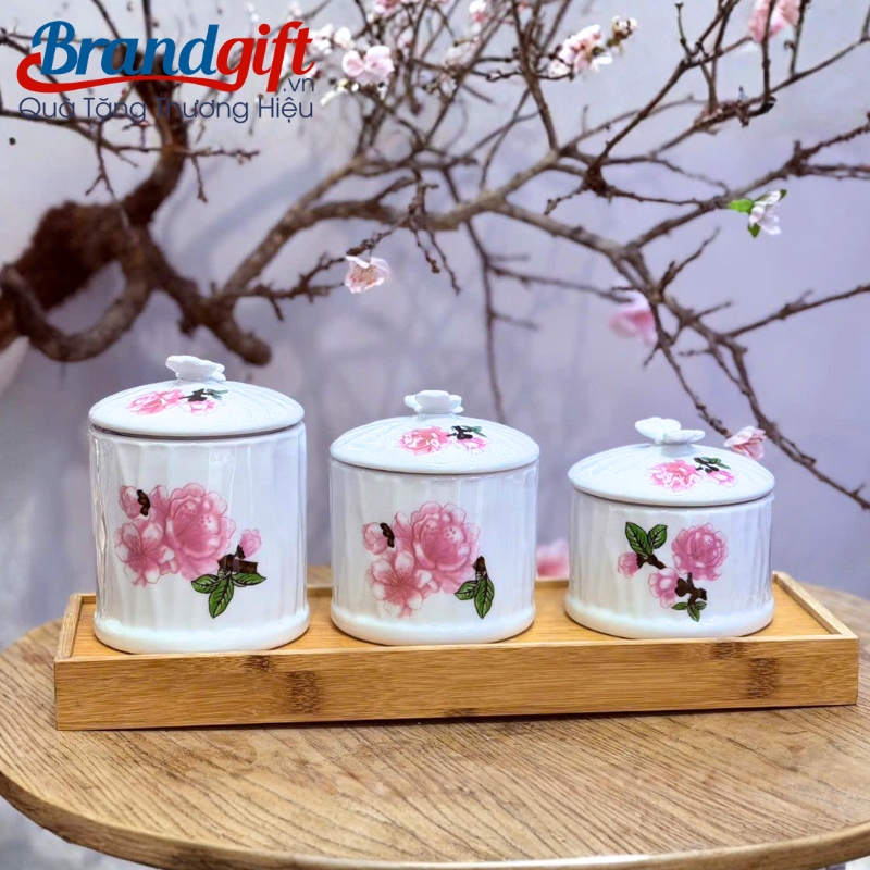 | Tên | Bộ 3 khay mứt Tết quà tặng in logo men trắng decal đào hồng KM-37 | Kích thước | Cao 12cm, 14cm, 16cm; Đường kính 11cm |