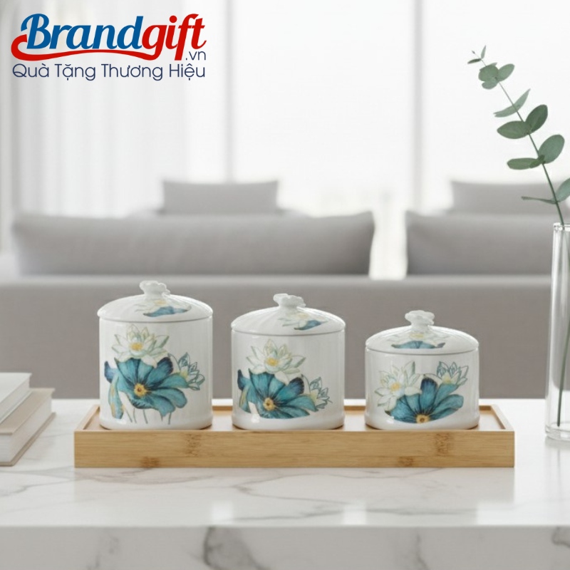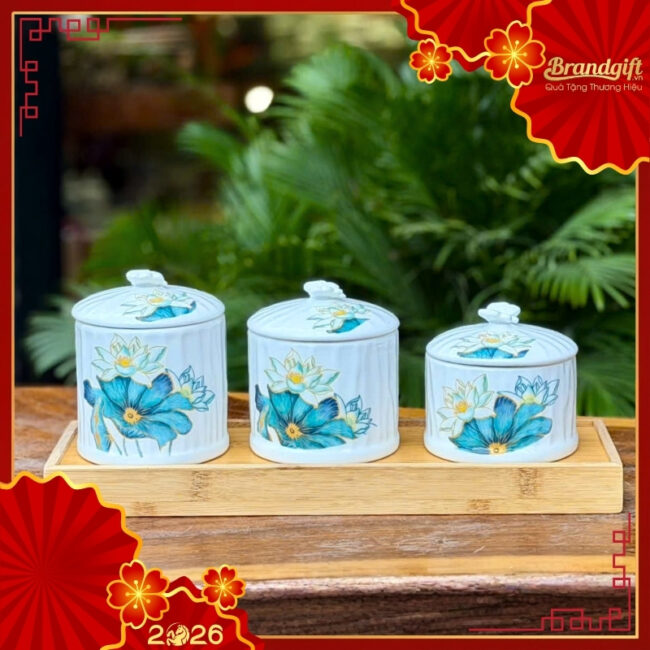 Bộ 3 hũ mứt sứ quà tặng Tết in logo men trắng decal sen xanh KM-38 mang vẻ đẹp thanh cao, thuần khiết, đậm chất văn hóa Việt Nam. Họa tiết hoa sen xanh tinh tế biểu trưng cho sự bình yên, trí tuệ và phẩm chất tốt đẹp, rất phù hợp làm quà tặng trong các dịp lễ, Tết trang trọng.