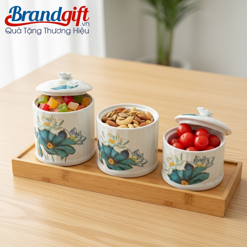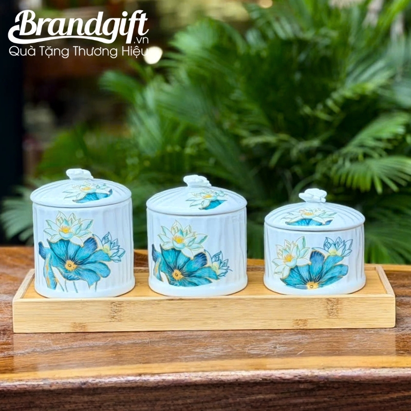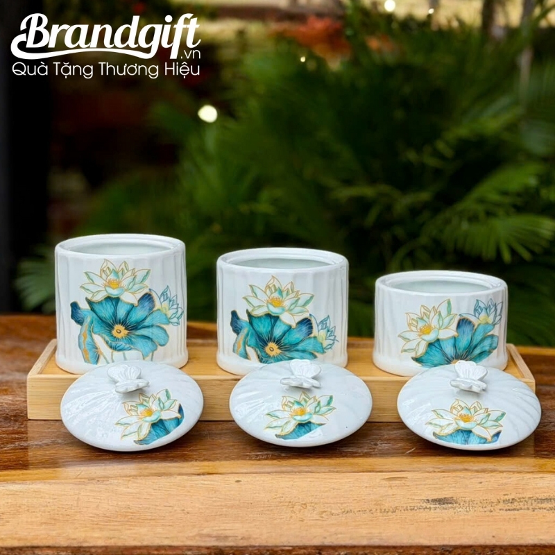 | Tên | Bộ 3 hũ mứt sứ quà tặng Tết in logo men trắng decal sen xanh | Kích thước | Cao 12cm, 14cm, 16cm; Đường kính 11cm |