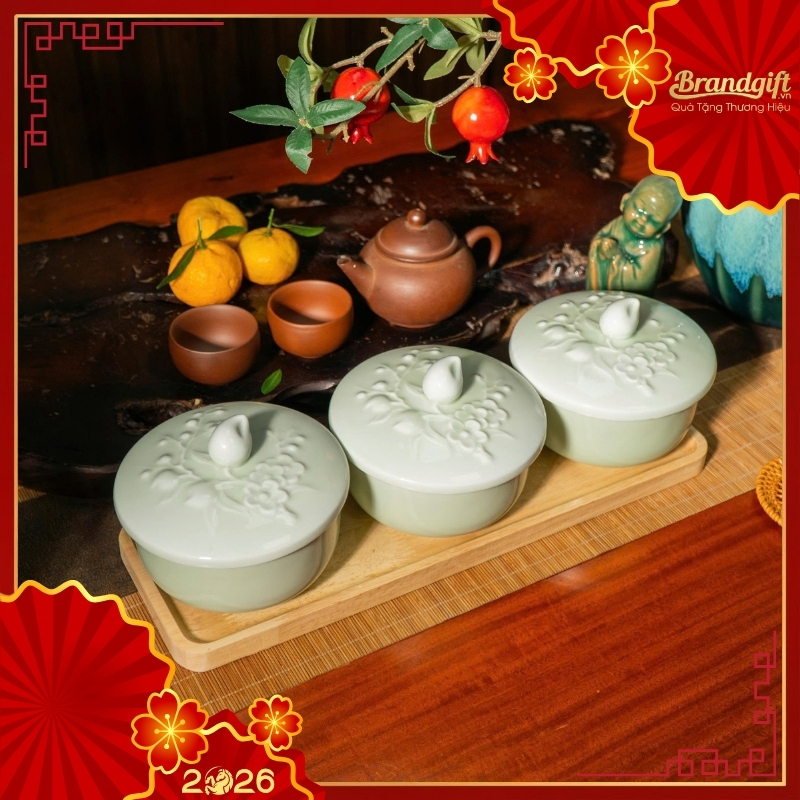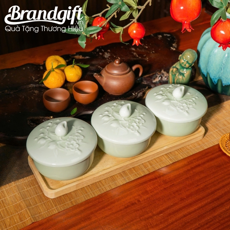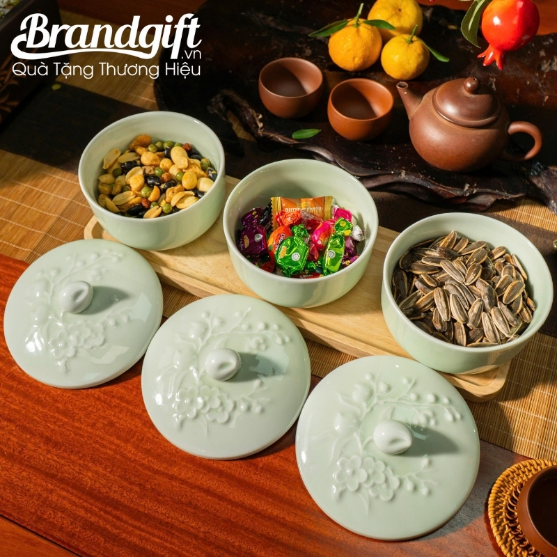 | Tên | Bộ 3 hũ mứt sứ in logo quà tặng Tết men ngọc hoa nổi | ||