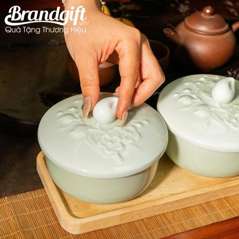 Bộ 3 hũ mứt sứ in logo quà tặng Tết men ngọc hoa nổi KM-42 đại diện cho vẻ đẹp cổ điển, trang nhã và sang trọng, rất được ưa chuộng trong dịp Tết. Với họa tiết hoa khắc nổi tinh tế trên nền men ngọc quý phái, đây là món quà thể hiện sự tỉ mỉ và tâm huyết của doanh nghiệp, biến món quà thành lời chúc bình an và thịnh vượng đầy ý nghĩa.
