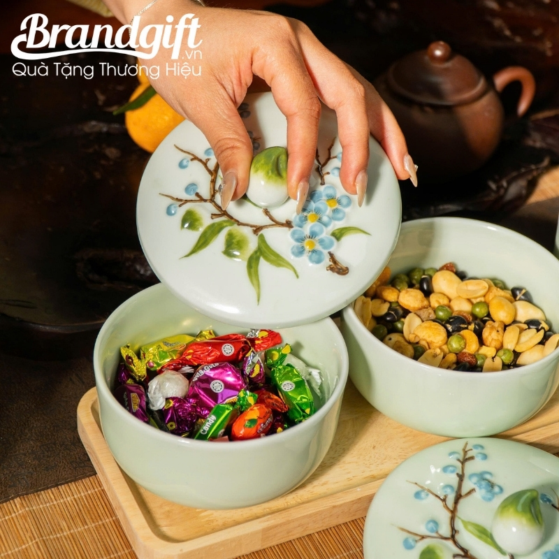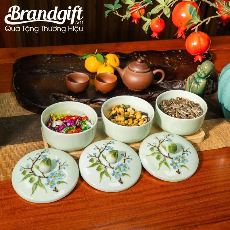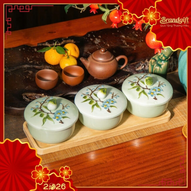 | Tên | Bộ 3 hũ mứt Tết in logo quà tặng vẽ đào xanh kèm khay gỗ | ||