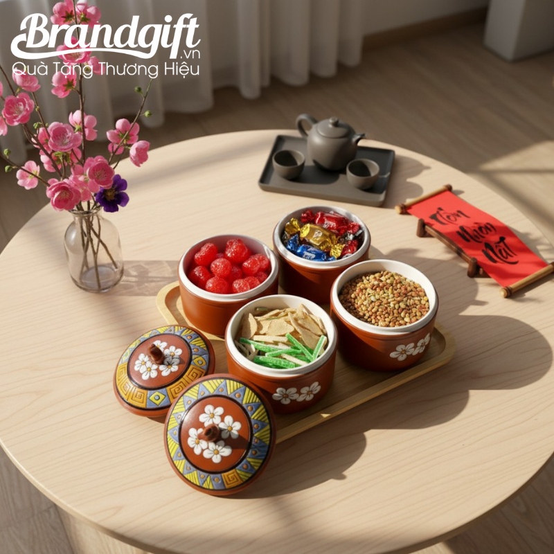 - BrandGift cung cấp dịch vụ in decal logo lên bộ hũ mứt theo yêu cầu, giúp logo doanh nghiệp sẽ được thể hiện một cách tinh tế, trở thành một phần của câu chuyện văn hóa mà món quà truyền tải.