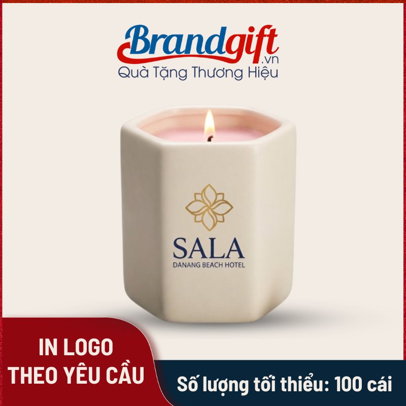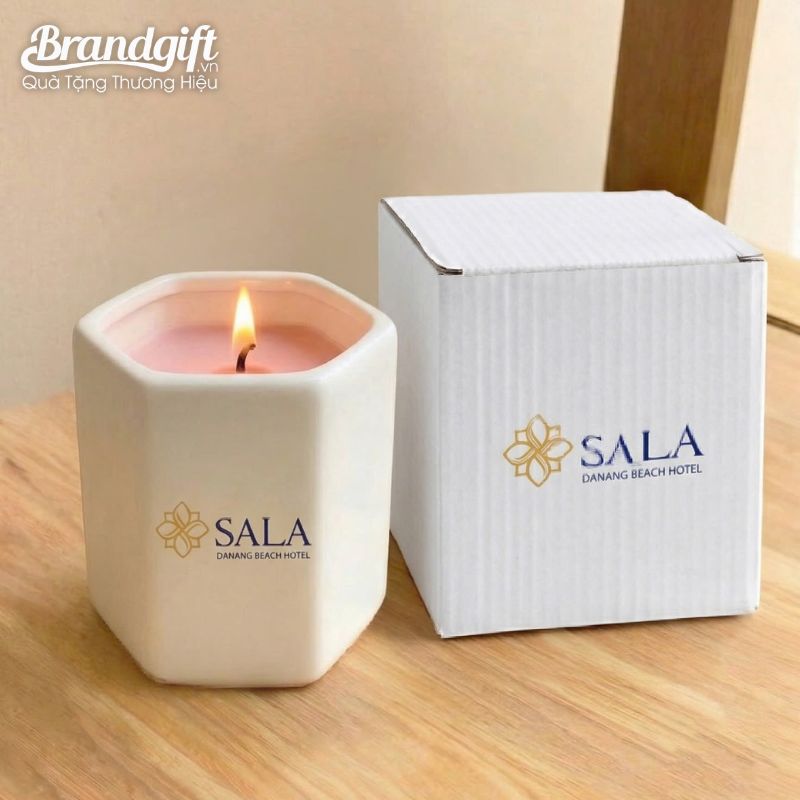 Logo doanh nghiệp (như mẫu SALA Danang Beach Hotel) sẽ được hiển thị với màu sắc chuẩn xác, độ chi tiết cao và hoàn toàn không bị trầy xước hay phai màu bởi nhiệt độ của nến.