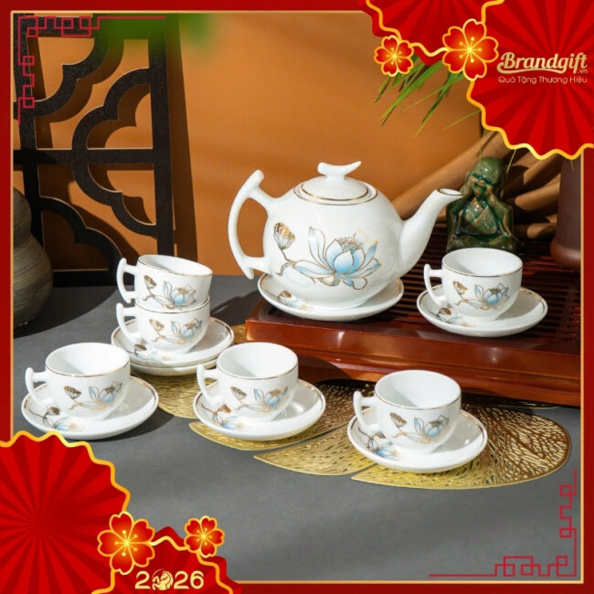 Bộ trà in logo làm quà tặng thể hiện sự tinh tế và đẳng cấp của doanh nghiệp. Brandgift kết hợp cùng hộp quà sang trọng, bộ ấm chén sẽ là đại sứ thương hiệu hoàn hảo, nâng tầm vị thế công ty bạn.