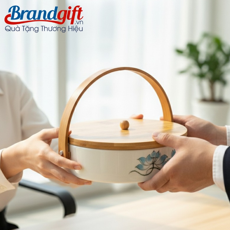 - Nắp đậy và quai xách được làm từ gỗ tự nhiên cao cấp. Sự kết hợp giữa chất liệu mộc mạc và gốm sứ tinh tế tạo nên vẻ ngoài độc đáo, đồng thời quai xách giúp việc di chuyển khay mứt trở nên cực kỳ tiện lợi và trang trọng.
