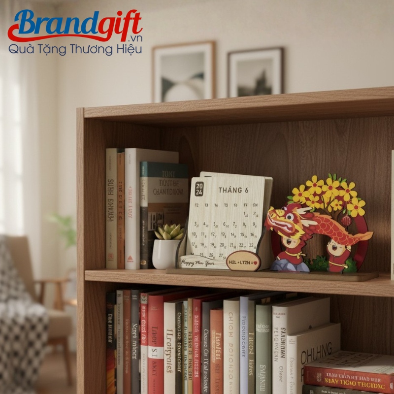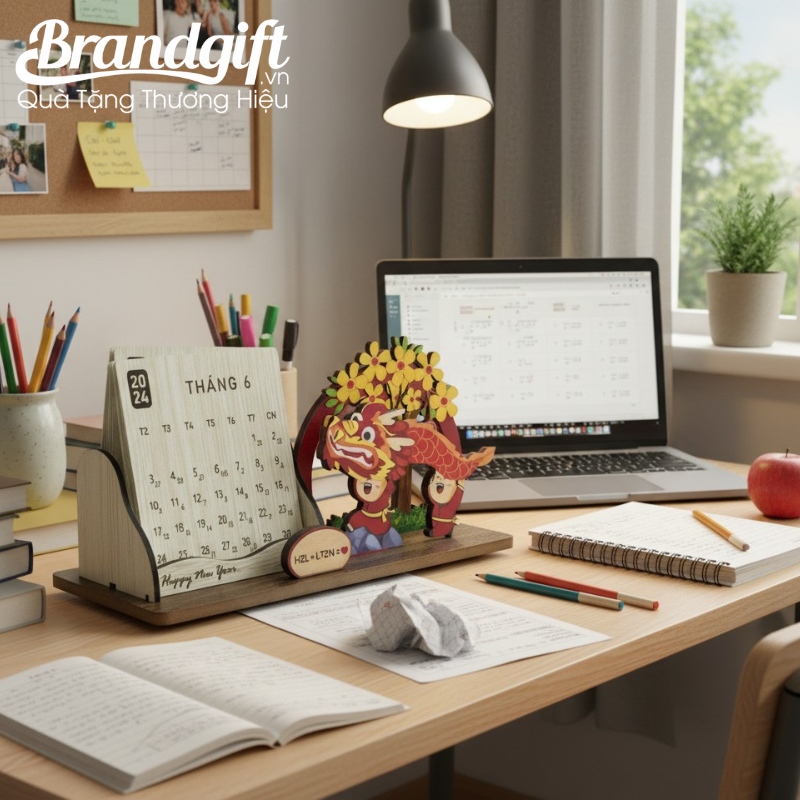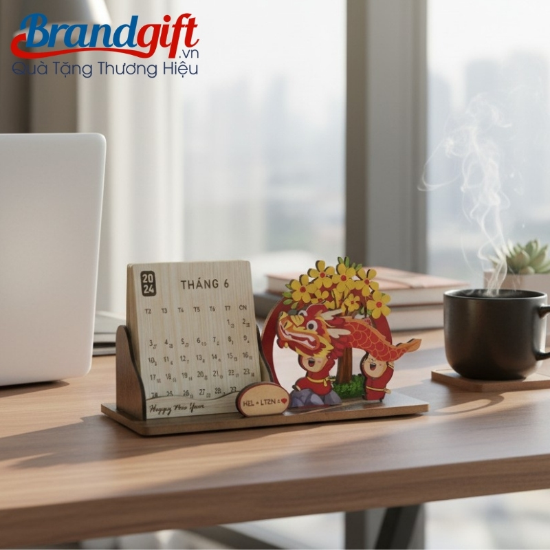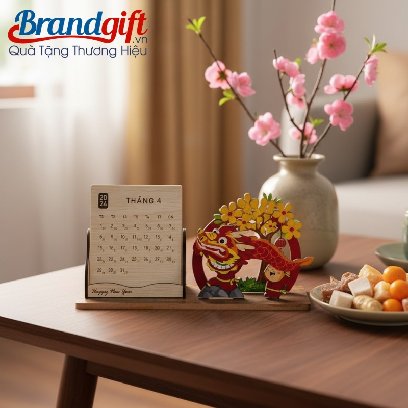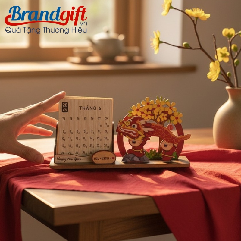 - Quà Tặng BrandGift cung cấp dịch vụ in lưới hoặc khắc laser logo doanh nghiệp lên phần đế gỗ của lịch. Logo sẽ hiện lên tinh tế, sang trọng, giúp thương hiệu của bạn đồng hành cùng người nhận trong suốt 365 ngày.