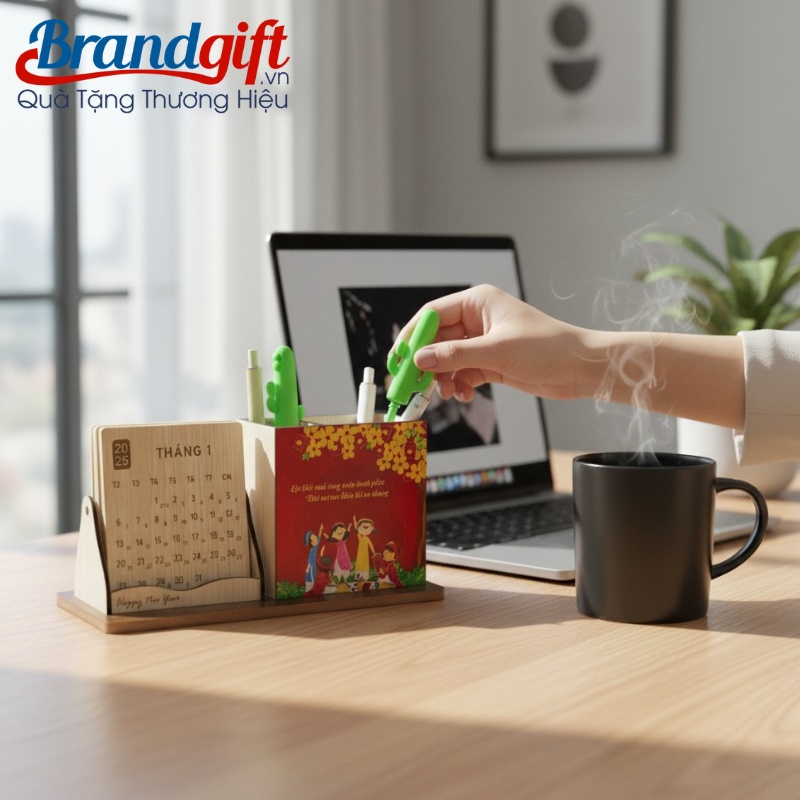 Mẫu lịch gỗ để bàn quà tặng in logo này đặc biệt phù hợp dành tặng cho nhân viên văn phòng hoặc học sinh – sinh viên. Với khả năng in ấn logo và hình ảnh linh hoạt theo yêu cầu, BrandGift giúp doanh nghiệp biến vật phẩm này thành một tấm biển quảng cáo mini đầy màu sắc, làn tỏa dấu ấn thương hiệu ngay trên góc học tập và làm việc hằng ngày.