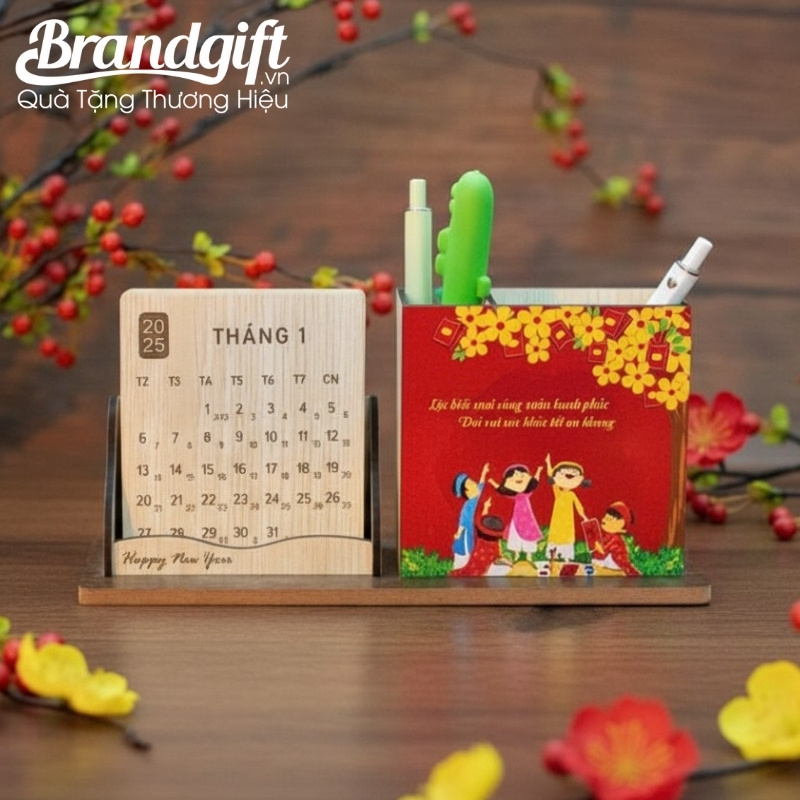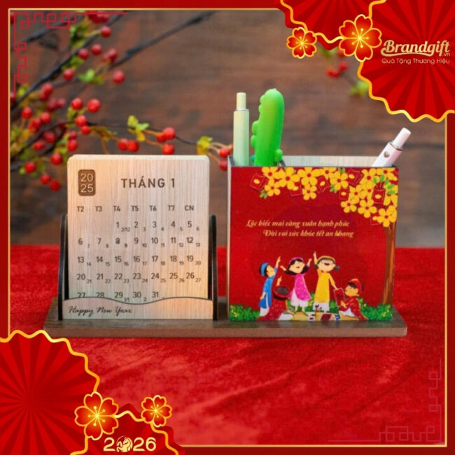 Lịch gỗ để bàn kết hợp ống đựng bút in logo làm quà Tết 2026 LĐB-05 là giải pháp quà Tết thông minh cho không gian làm việc hiện đại. Sản phẩm vừa là công cụ quản lý thời gian hiệu quả, vừa là “trợ thủ” đắc lực giúp bàn làm việc luôn gọn gàng, ngăn nắp.