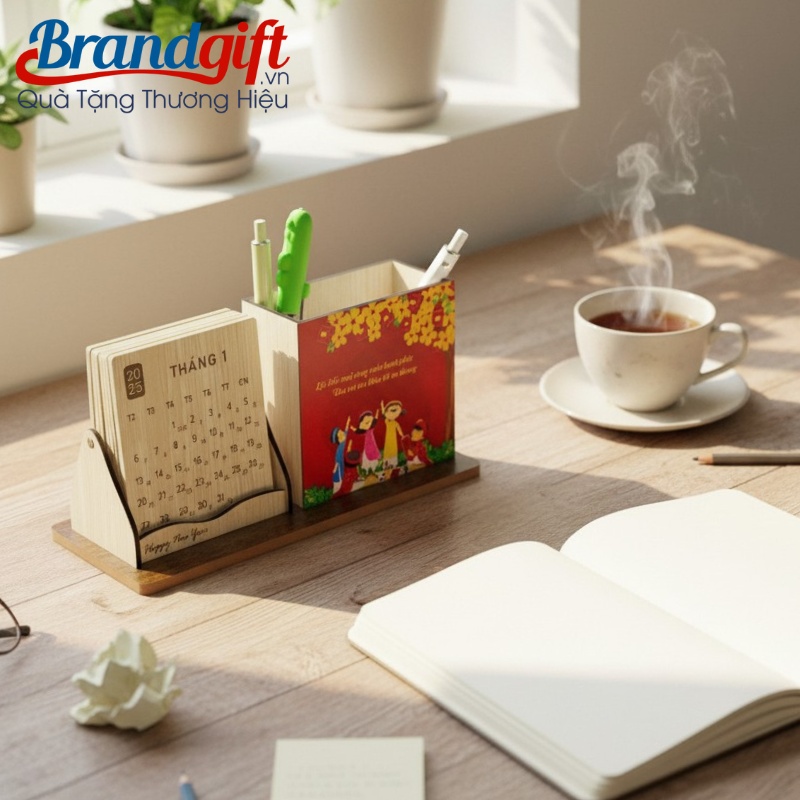 Mẫu lịch gỗ để bàn quà tặng in logo này đặc biệt phù hợp dành tặng cho nhân viên văn phòng hoặc học sinh – sinh viên. Với khả năng in ấn logo và hình ảnh linh hoạt theo yêu cầu, BrandGift giúp doanh nghiệp biến vật phẩm này thành một tấm biển quảng cáo mini đầy màu sắc, làn tỏa dấu ấn thương hiệu ngay trên góc học tập và làm việc hằng ngày.