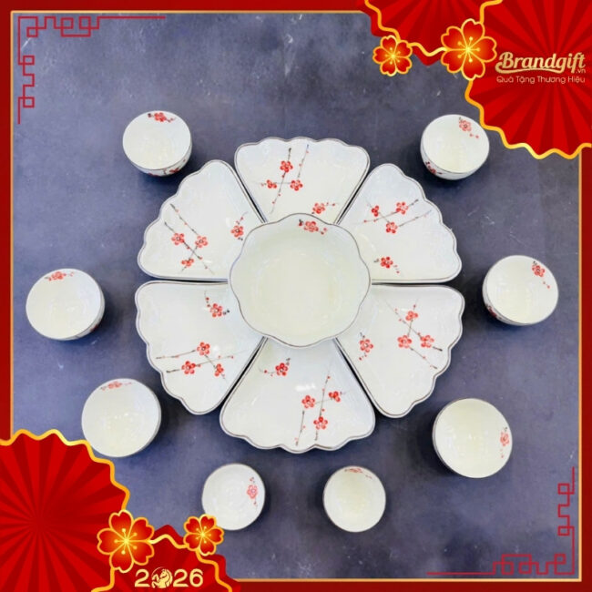 Bộ bát đĩa hoa mặt trời in logo quà tặng vẽ hoa đào hồng BD-47 mang trọn vẹn không khí sum vầy của mâm cơm ngày Tết. Bộ dùng cụ bàn ăn in logo này là một tác phẩm nghệ thuật, nơi hình ảnh hoa mặt trời tượng trưng cho sự gắn kết, hòa quyện cùng họa tiết hoa đào báo hiệu một năm mới an khang, thịnh vượng.