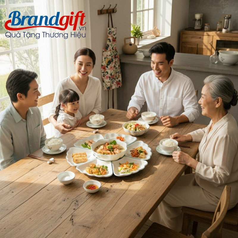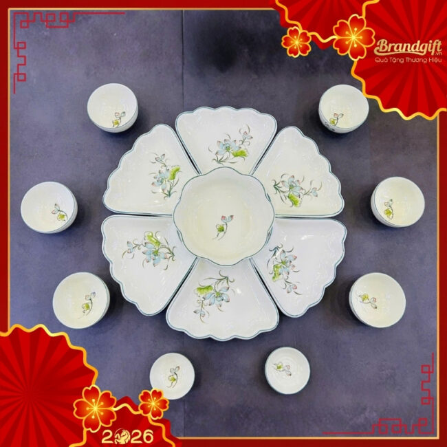 - Bộ bàn ăn quà tặng này bao gồm 15 món: 6 bát cơm, 1 tô lớn, 6 đĩa cánh hoa, 1 bát mắm và 1 đĩa muối. Sự sắp xếp đồng bộ này giúp người dùng dễ dàng kiến tạo nên những mâm cơm chỉn chu, gọn gàng và đầy đặn.