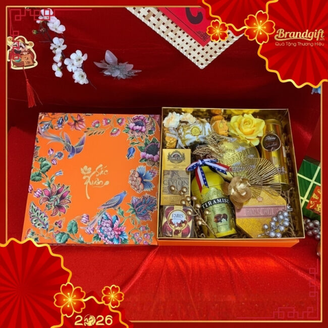 Nổi bật với sắc cam ấm áp và họa tiết “Hoa Điểu Cát Tường” tinh xảo, mẫu hộp quà Tết in logo này mang đến một cảm giác sang trọng, quyền quý và đầy hân hoan, tựa như một tấm gấm vóc hoàng gia. Không chỉ đẹp về hình thức, món quà còn chinh phục người nhận bằng những hương vị tinh tế, là cách doanh nghiệp thể hiện sự trân trọng và gu thẩm mỹ đẳng cấp của mình.