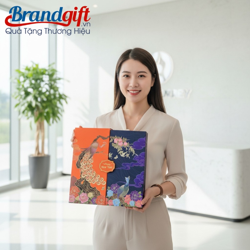 - BrandGift hỗ trợ in lưới logo trực tiếp lên nắp hộp hoặc thiết kế thiệp chúc Tết đính kèm. Đây là giải pháp giúp thương hiệu của doanh nghiệp hiện diện một cách chuyên nghiệp và rõ ràng trên món quà.