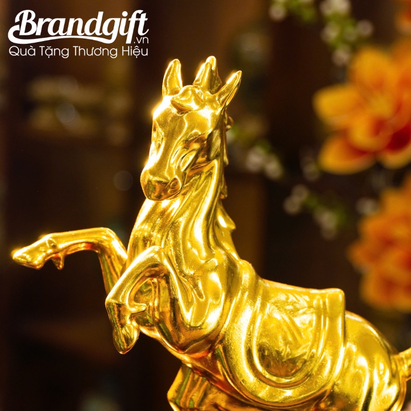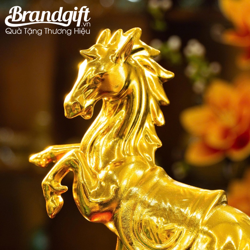 Tượng kim mã uy phong quà tặng in logo dát vàng 24K TLV-08 là kiệt tác cao cấp bậc nhất trong bộ sưu tập quà Tết Xuân Bính Ngọ 2026 của BrandGift. Tác phẩm khắc họa hình ảnh tuấn mã hiên ngang tung vó trên đỉnh vàng son, mang ý nghĩa chiêu tài lộc, gia tăng vượng khí và khẳng định vị thế của người sở hữu.