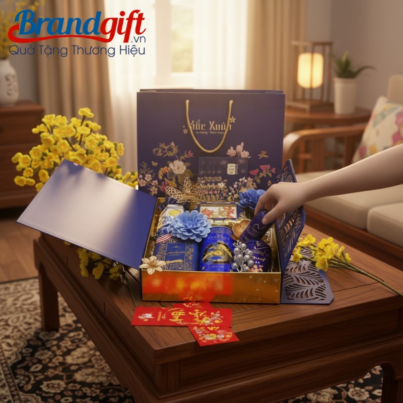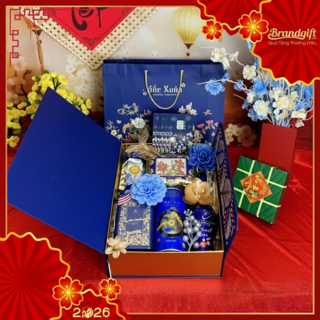 Trong không khí rộn ràng của mùa xuân Bính Ngọ 2026, giỏ quà bánh kẹo Tết in logo màu xanh dương “Sắc Xuân” SQT-01 là lời tri ân được gói trọn trong hương vị bánh kẹo thượng hạng. Sắc xanh dương hoàng gia chủ đạo mang đến một vẻ đẹp hiện đại, sang trọng, biểu trưng cho niềm tin vào một năm mới phát triển và thành công rực rỡ.
