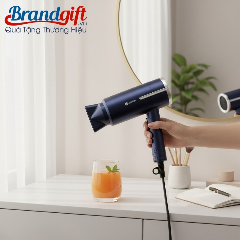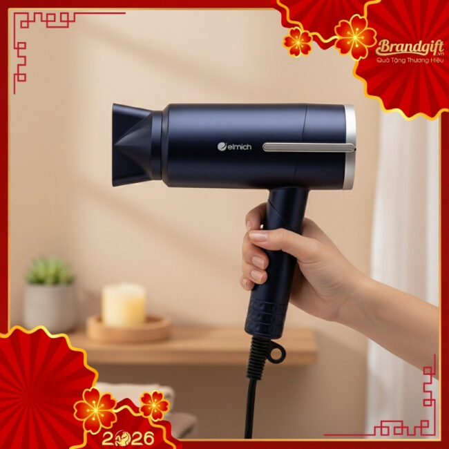 Máy sấy tóc gấp gọn Elmich in logo quà tặng 1800W xanh navy MST-03 là một món quà tặng điện gia dụng hữu ích, kết hợp hoàn hảo giữa hiệu suất chuyên nghiệp và thiết kế nhỏ gọn thông minh.