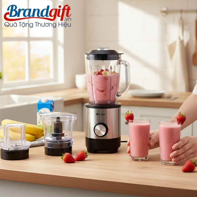 - Bộ máy xay sinh tố quà tặng được đóng gói cẩn thận trong hộp carton cứng cáp đi kèm túi vải không dệt in logo, khẳng định tâm ý của doanh nghiệp đối với người nhận.