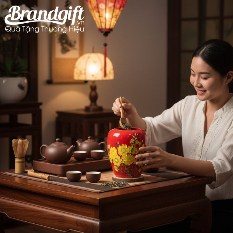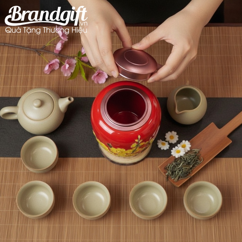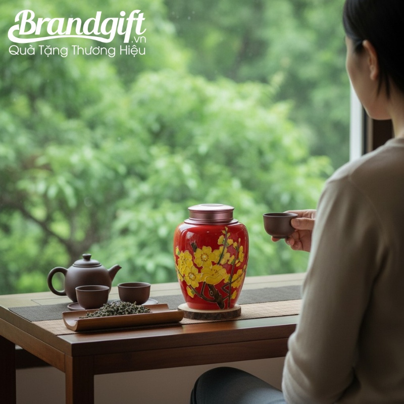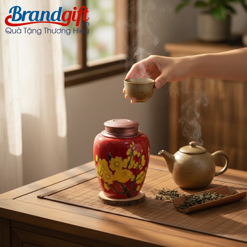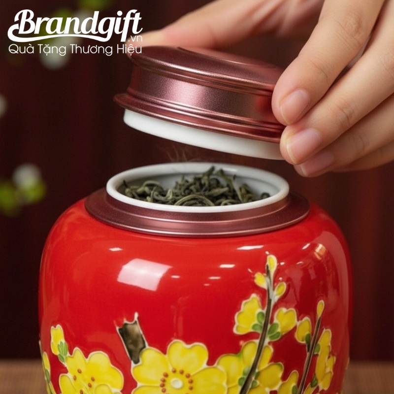 - Logo doanh nghiệp được in decal sắc nét lên thân lọ chè, biến tặng phẩm thành sứ giả lan tỏa dấu ấn thương hiệu tinh tế.