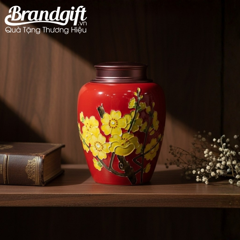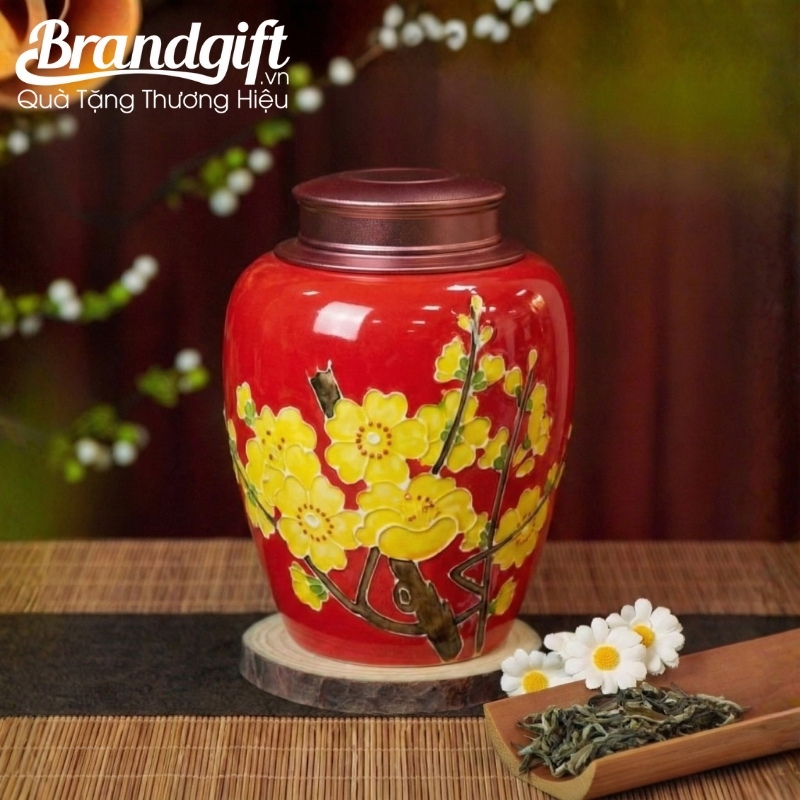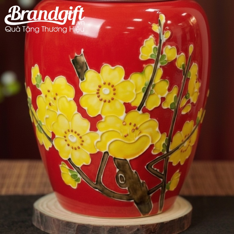Hũ đựng trà Bát Tràng quà tặng men đỏ dáng bí hoa mai vàng vẽ nổi HDT-47 là tặng phẩm mang trọn vẹn không khí và sắc xuân rực rỡ của ngày Tết cổ truyền. Trên mền men đỏ rực rỡ, những đóa mai vàng phú quý được vẽ nổi sống động giúp nâng tầm vẻ đẹp thẩm mỹ, đồng thời mang theo lời chúc về một năm mới may mắn và thịnh vượng.