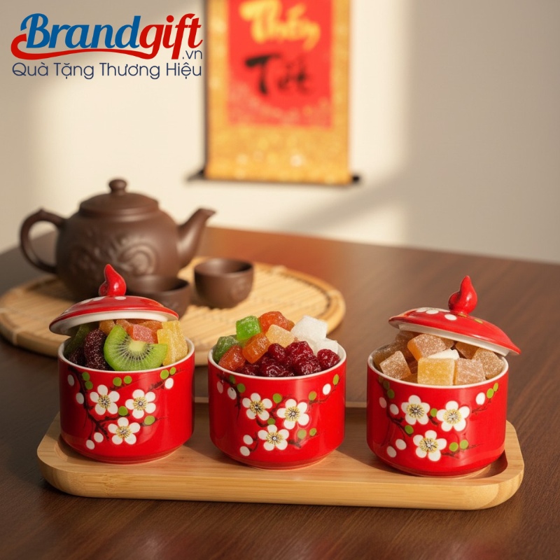 Bộ hũ mứt Tết in logo này là lựa chọn quà tặng vô cùng ý nghĩa và thiết thực để doanh nghiệp tri ân đội ngũ nhân viên, khách hàng, lan tỏa niềm vui và sự hứng khởi cho một năm mới. Để hoàn thiện món quà, BrandGift sẽ giúp doanh nghiệp khắc dấu ấn thương hiệu, biến tặng phẩm thành một lời chúc may mắn mang đậm bản sắc riêng.