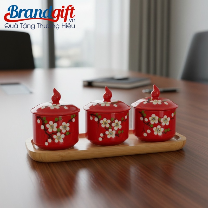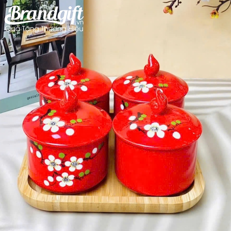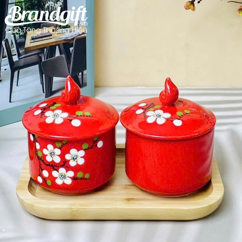 | Tên | Set hũ mứt sứ in logo quà tặng men đỏ vẽ hoa đào trắng | Kích thước | |