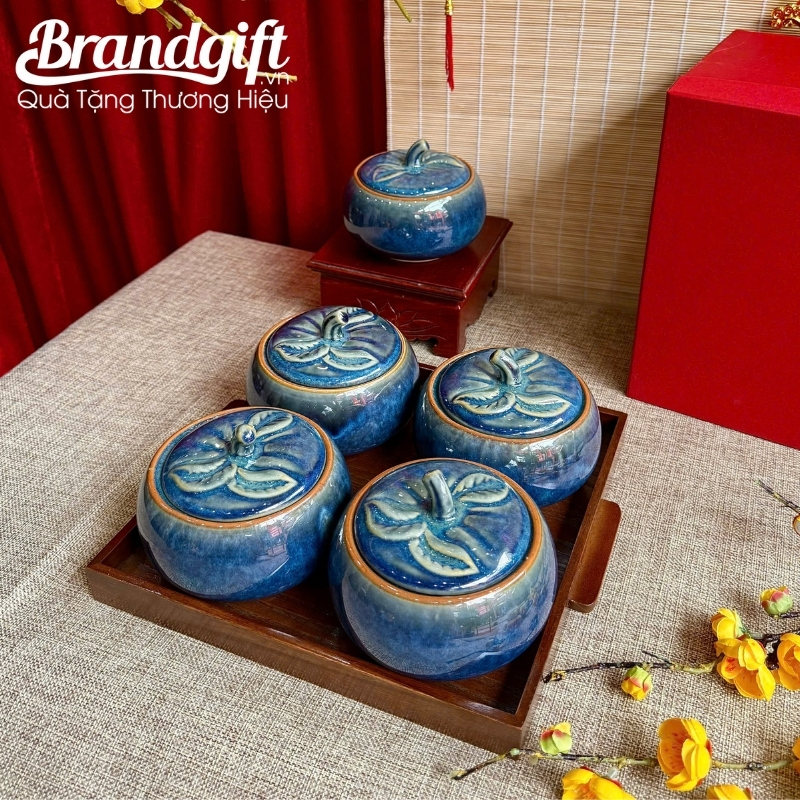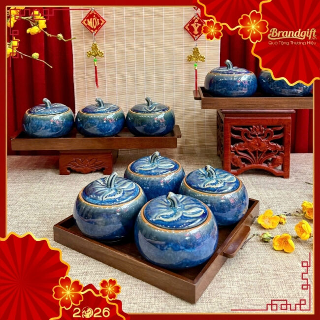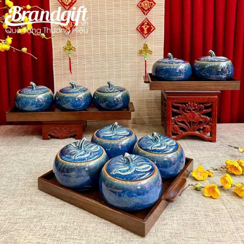Sắc xanh lam của men hỏa biến không chỉ tạo nên vẻ đẹp sang trọng, trầm tĩnh mà còn tượng trưng cho sự an lành, thịnh vượng và hy vọng, gửi gắm lời chúc tốt đẹp nhất cho một năm mới may mắn. Việc trao tặng bộ khay mứt in logo quà tặng này thể hiện sự chuyên nghiệp, gu thẩm mỹ cao của doanh nghiệp bạn, biến món quà tri ân thành một công cụ quảng bá thương hiệu hiệu quả và bền vững.