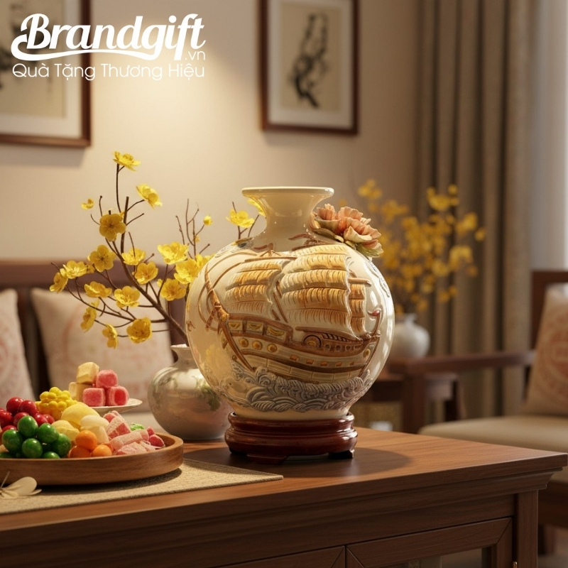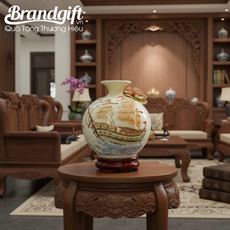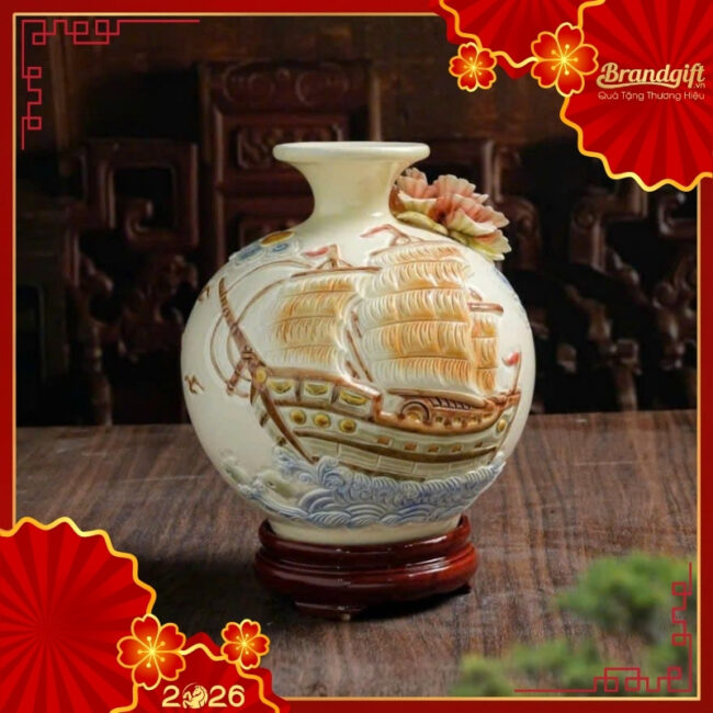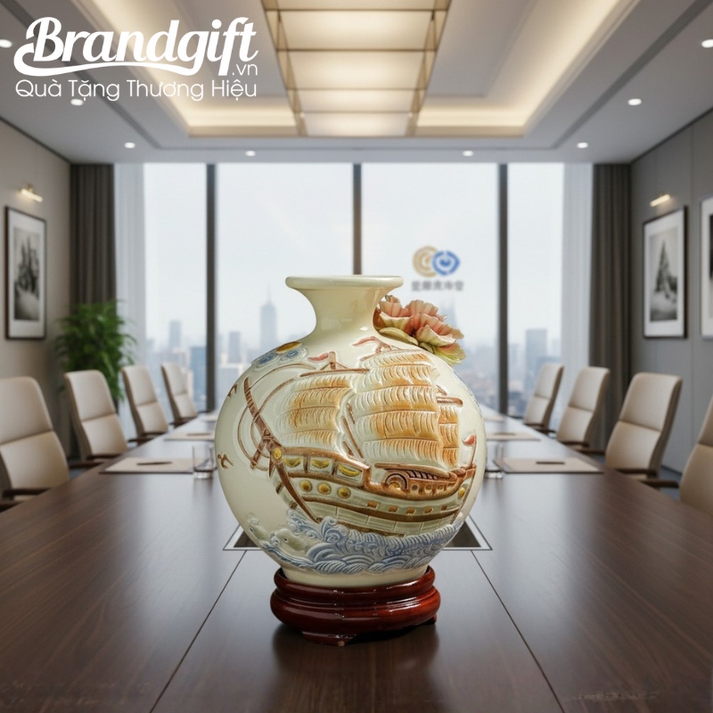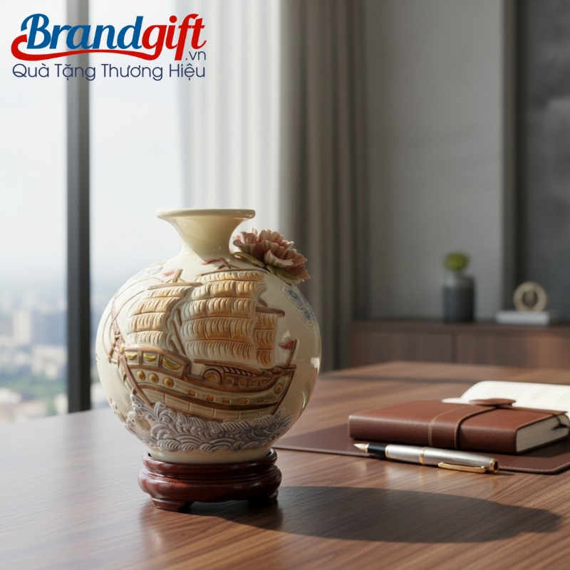 Mẫu bình hút lộc phong thủy quà tặng này sở hữu họa tiết Thuận Buồm Xuôi Gió cùng hoa mẫu đơn đắp nổi tinh xảo thu hút mọi ánh nhìn. Quý khách đặt mua tại BrandGift sẽ được tặng kèm đế gỗ, hộp xi lót lụa quai xách và hỗ trợ in logo theo yêu cầu, mang đến một tặng phẩm cao cấp, chỉn chu,.