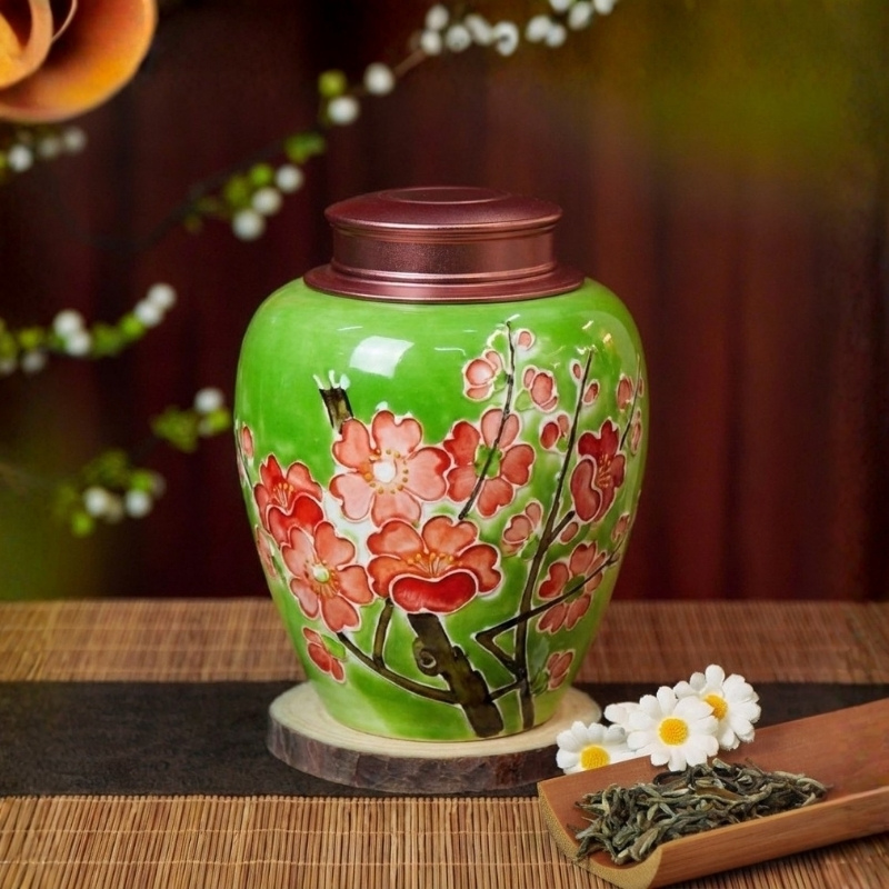 | Tên | Lọ chè gốm sứ quà tặng men lục vẽ hoa đào hồng dáng bí 300g | Đặc tính | An toàn cho sức khỏe, thân thiện với môi trường |