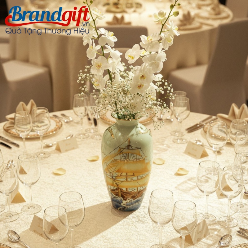 BrandGift cung cấp dịch vụ in decal vàng kim logo lên lọ hoa gốm sứ quà tặng theo yêu cầu doanh nghiệp
