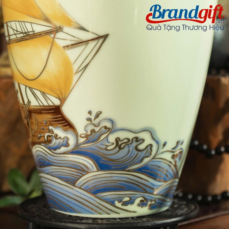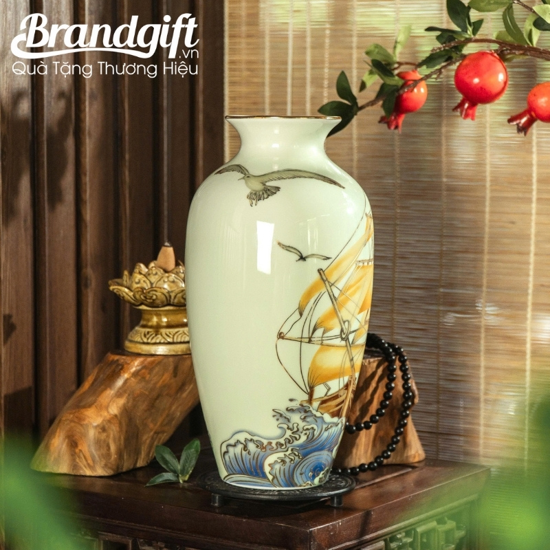 Lọ hoa gốm sứ quà tặng men ngọc họa tiết thuyền hải âu vàng kim 28cm LHGS-119 là tặng phẩm nghệ thuật mang theo khát vọng vươn xa, chinh phục những chân trời mới. Nền men ngọc thanh lịch cùng họa tiết con thuyền và hải âu được điểm xuyết vàng kim, biến sản phẩm thành biểu tượng của sự tự do, lạc quan và thành công trên thương trường rộng lớn.