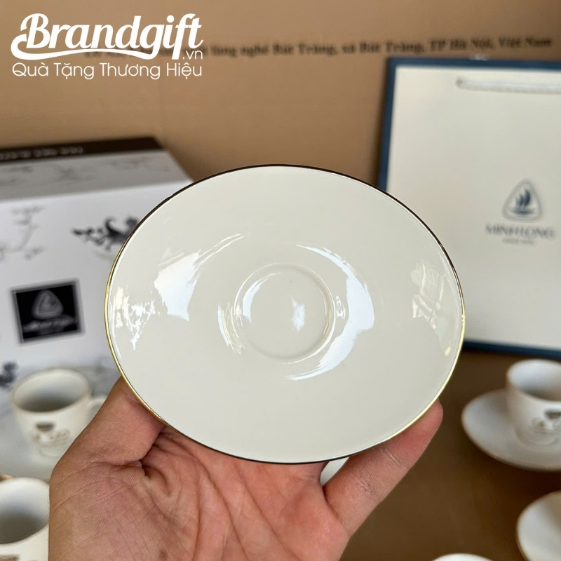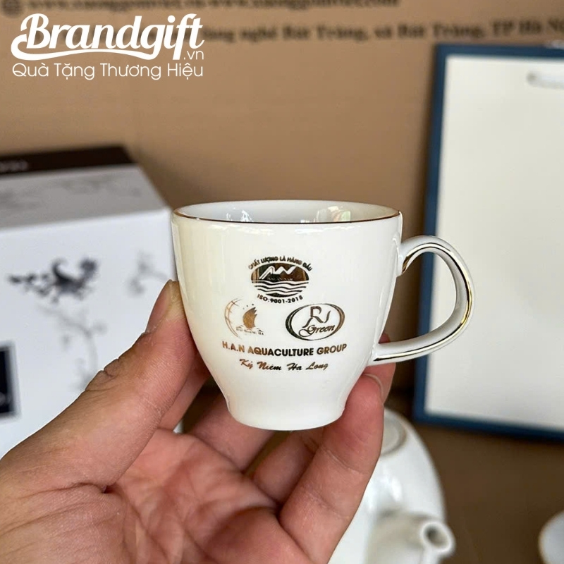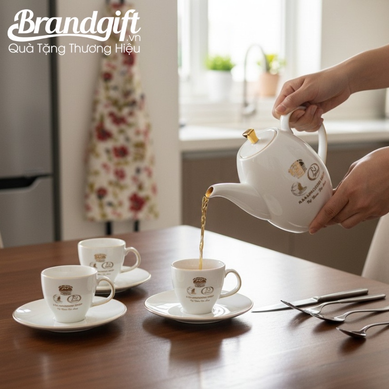 - BrandGift hỗ trợ in decal logo lên cả ấm và chén theo yêu cầu. Công nghệ in chất lượng cao đảm bảo logo bền màu, không phai, đồng bộ hóa hình ảnh doanh nghiệp trên toàn bộ sản phẩm.