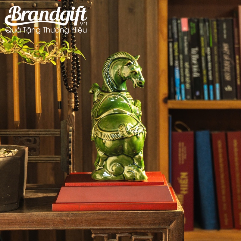 Mẫu tượng linh vật gốm sứ quà tặng này khắc họa hình ảnh ngựa thần đứng hiên ngang trên đồng tiền vàng, mang ý nghĩa chiêu tài, giữ lộc, là lời chúc cho một năm mới kinh doanh phát đạt, tiền tài tấn tới.