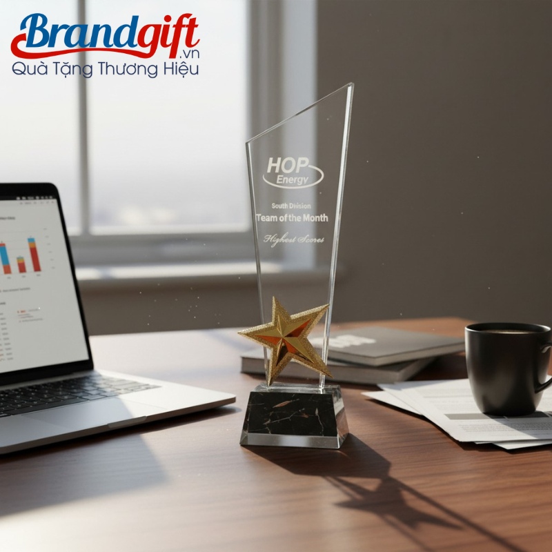 - Logo doanh nghiệp và các thông điệp vinh danh được in lưới tinh xảo trên bề mặt cúp pha lê, đảm bảo hình ảnh sắc nét, bền màu và sang trọng, thể hiện sự trân trọng mà doanh nghiệp muốn trao gửi.