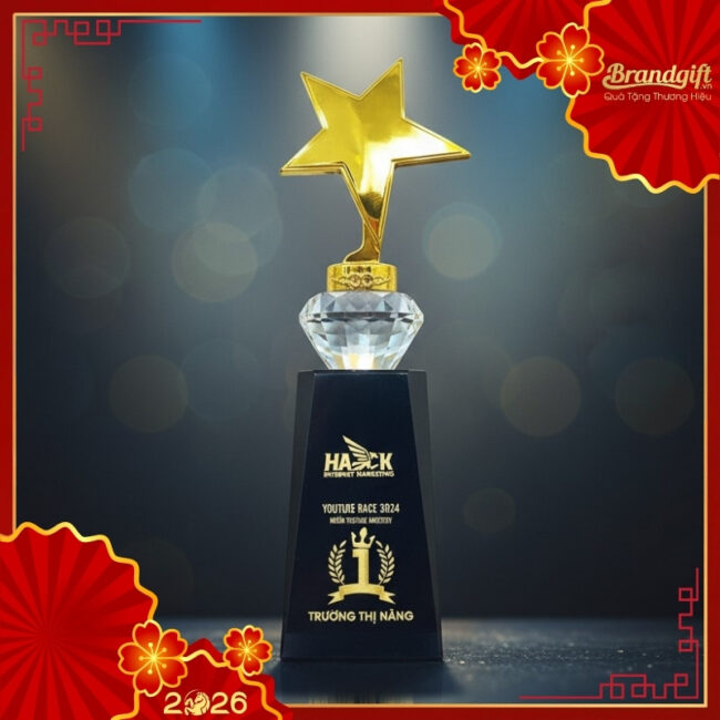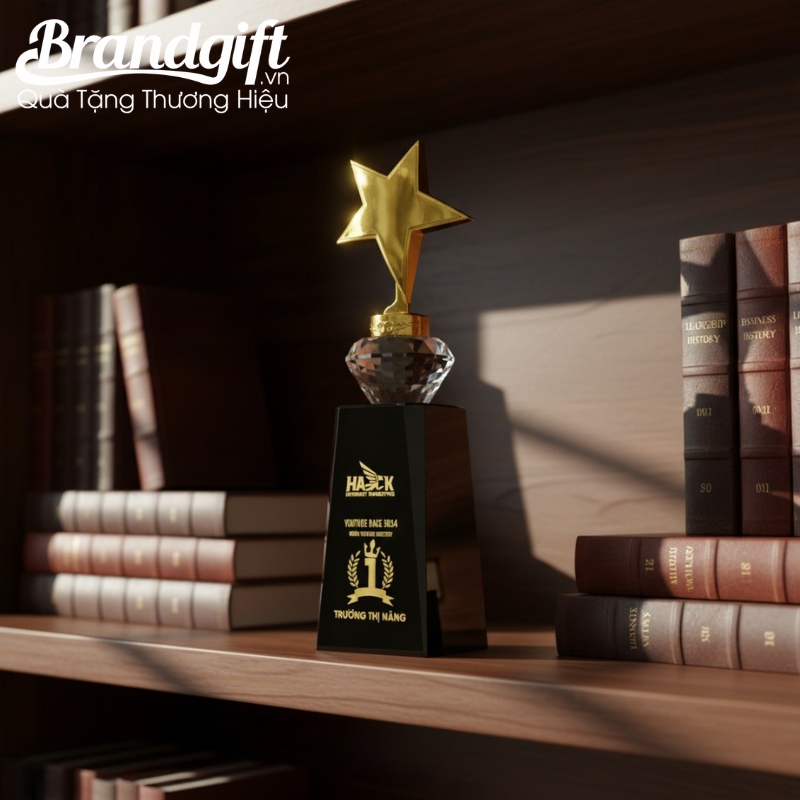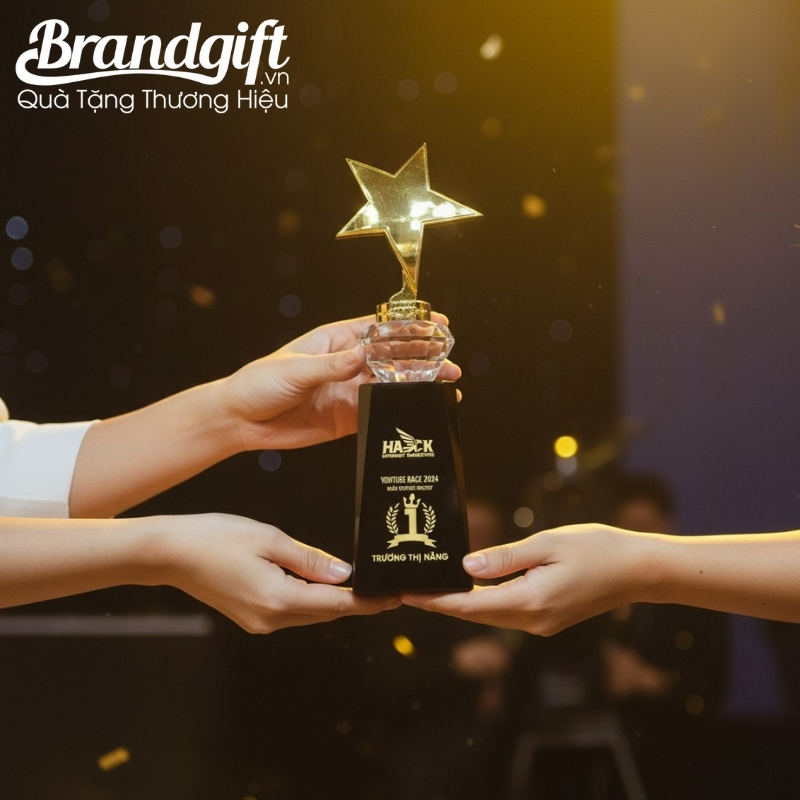 - Logo doanh nghiệp, tên giải thưởng và tên người nhận được in lưới màu vàng kim nổi bật trên nền đen của chân đế. Công nghệ in ấn hiện đại giúp mọi chi tiết đều được thể hiện sắc nét, trang trọng, xứng tầm với giá trị của giải thưởng.