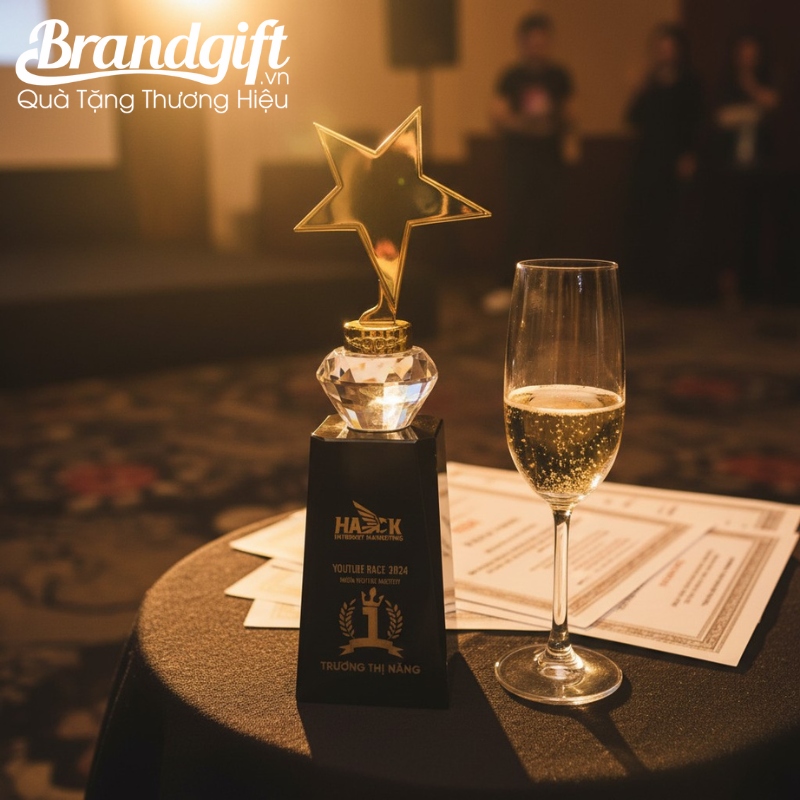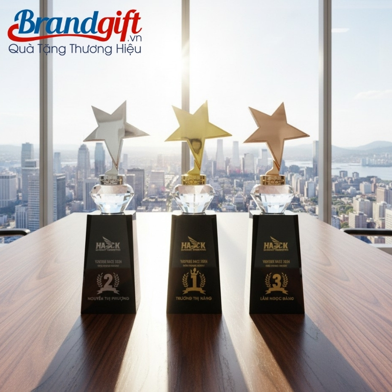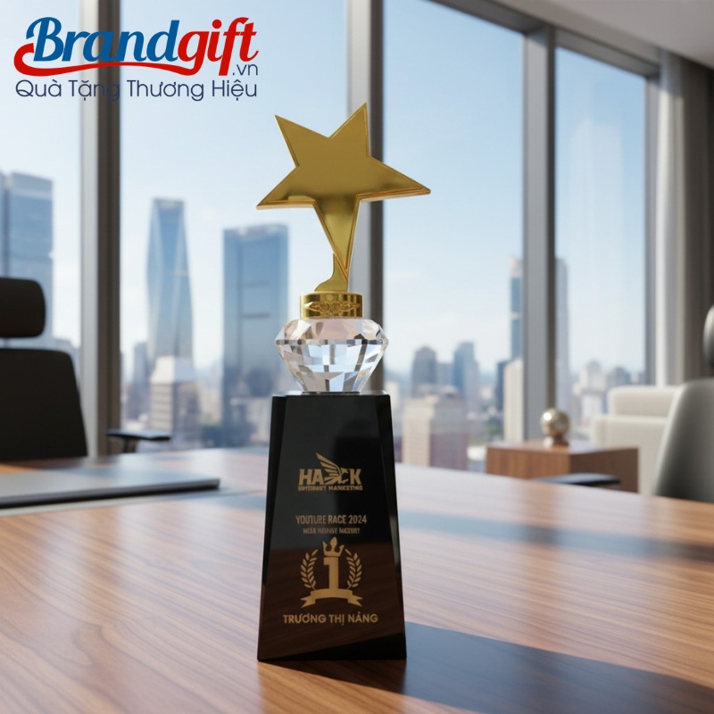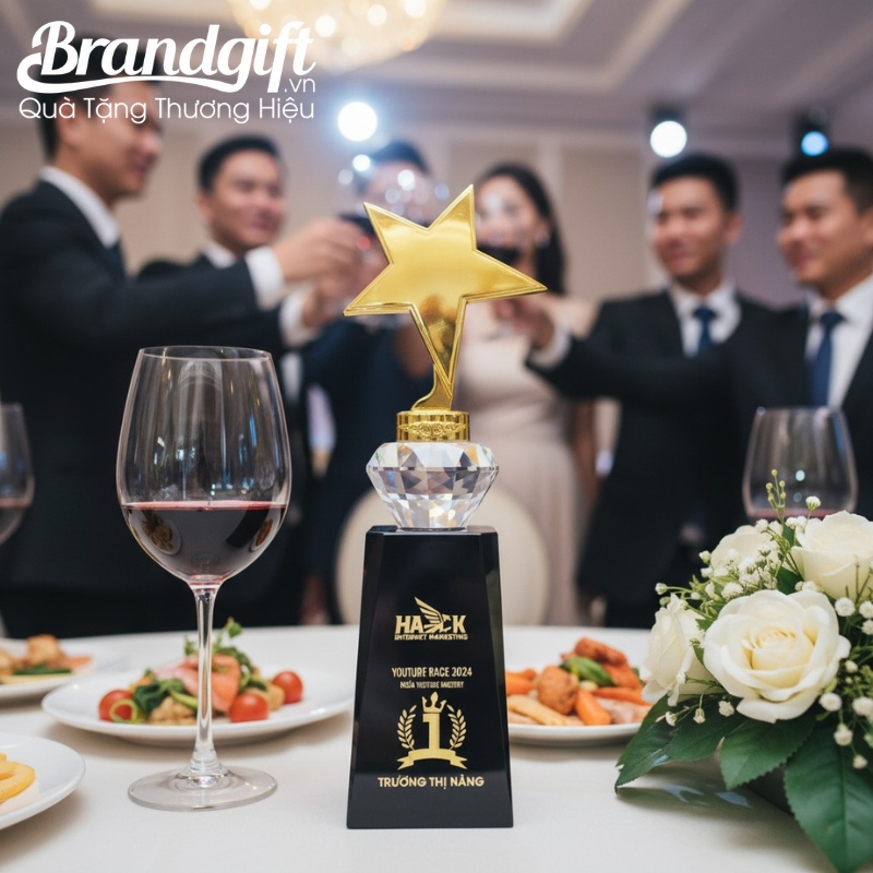 - Chiếc cúp biểu trưng được chế tác từ pha lê K7 cao cấp, có khả năng phản chiếu ánh sáng lấp lánh, biến tặng phẩm thành một tâm điểm rực rỡ ở bất kỳ không gian nào.