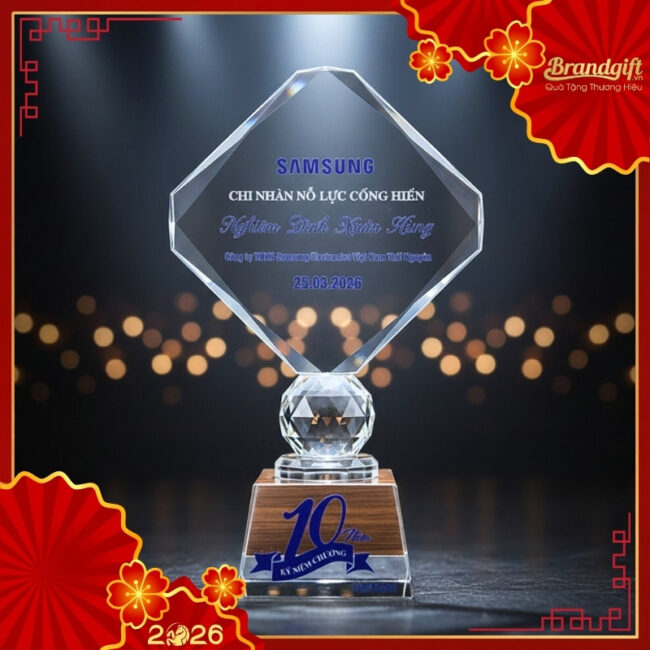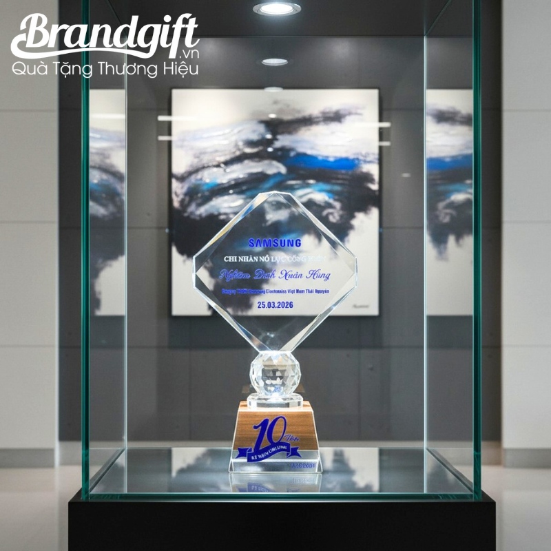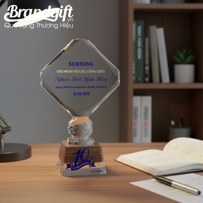 Đây là lựa chọn hoàn hảo để vinh danh những nhân viên cống hiến lâu năm, những nhà quản lý tài ba hoặc ghi nhận sự hợp tác của các đối tác chiến lược. BrandGift cung cấp dịch vụ in logo và tùy chỉnh kỷ niệm chương thoe yêu cầu, đồng hành cùng doanh nghiệp truyền tải trọn vẹn thông điệp, biến mỗi chiếc cúp thành một kỷ vật độc nhất.