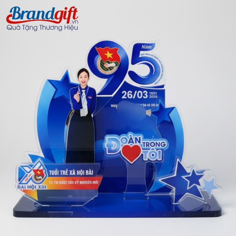 Sản phẩm được chế tác từ chất liệu pha lê K9 cao cấp, có khả năng tán sắc ánh sáng lung linh và độ bền cực cao. Quà Tặng BrandGift cung cấp đa dạng kiểu dáng mang tính biểu tượng như hình ngọn lửa, cánh buồm hay hình ngôi sao được vát cạnh tinh xảo. Logo Đoàn thanh niên và thông điệp kỷ niệm được khắc laser 3D hoặc in UV trực tiếp, đảm bảo độ sắc nét vĩnh viễn và không bị mờ theo thời gian.