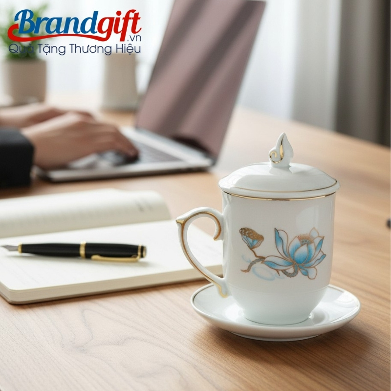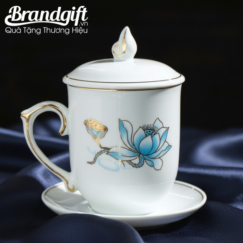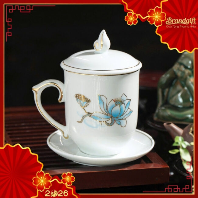 Trên nền men sứ trắng ngà, họa tiết hoa sen xanh viền vàng kim được in sắc nét, là biểu tượng cho sự thuần khiết, an nhiên và thành công viên mãn. Với vẻ đẹp sang trọng và ý nghĩa sâu sắc, đây là lựa chọn hoàn hảo để thể hiện sự trân trọng và mong muốn gắn kết lâu dài với các đối tác, khách hàng quan trọng.