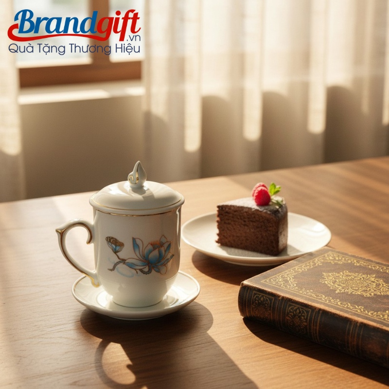 Ly sứ quai tim nắp lửa quà tặng họa sen xanh vàng kim kèm đĩa lót CST-M99 kết hợp hoàn hảo giữa tính thẩm mỹ nghệ thuật và công năng sử dụng vượt trội. Mẫu cốc sứ in logo quà tặng này mang đến công năng tiện ích với nắp đậy giữ nhiệt và đĩa lót sạch sẽ, giúp nâng tầm trải nghiệm uống nước thành những phút giây thư giãn trọn vẹn.