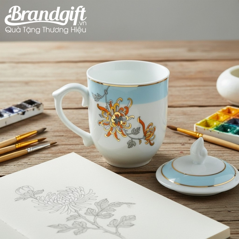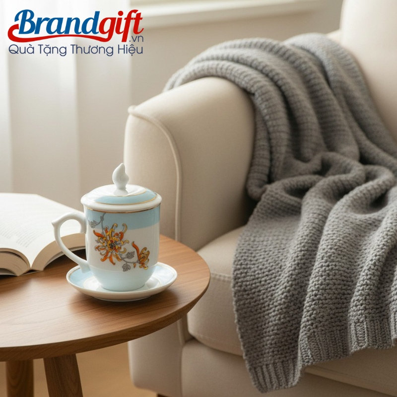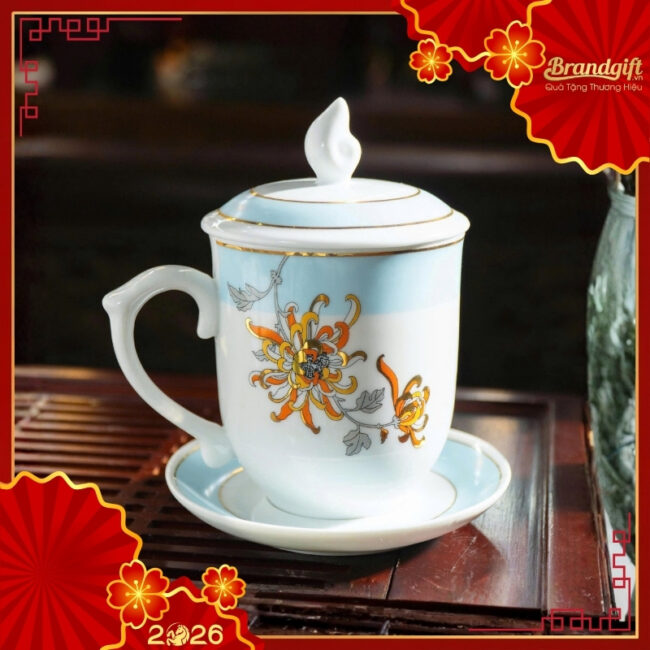 Cốc sứ quai tim nắp lửa quà tặng họa tiết hoa bỉ ngạn vàng kim kèm đĩa lót CST-M98 là mẫu ly sứ in logo quà tặng cao cấp, thể hiện sự quan tâm trọn vẹn và tinh tế. Đây là tặng phẩm lý tưởng dành cho các đối tác nữ, nữ lãnh đạo hay khách hàng VIP – những người luôn yêu cầu sự hoàn mỹ và chỉn chu trong từng chi tiết.