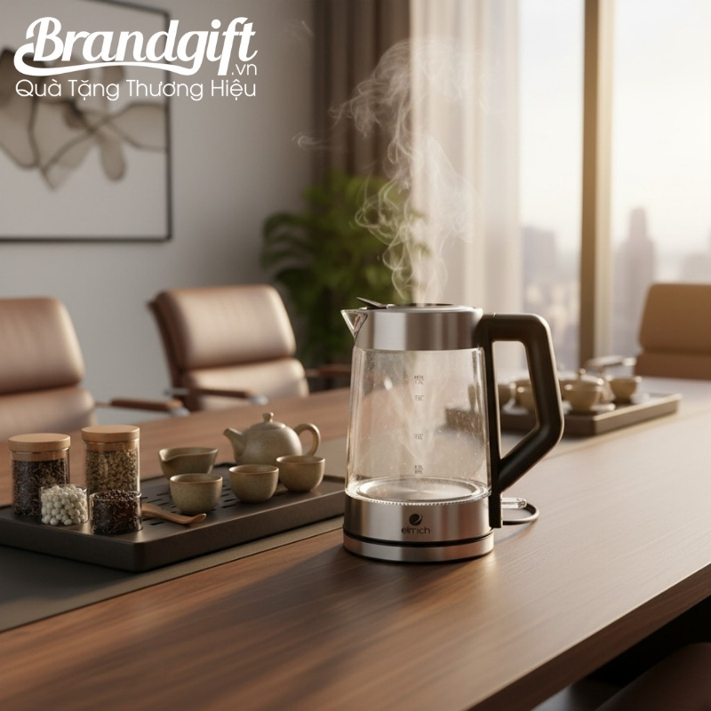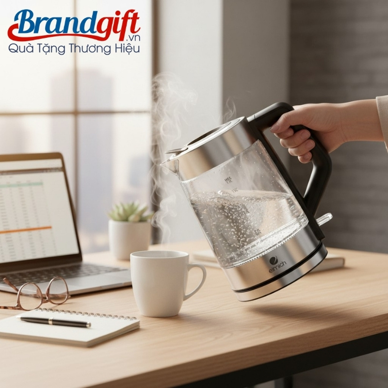 Điểm nhấn của mẫu bình siêu tốc quà tặng này nằm ở chất liệu thủy tinh chịu nhiệt cho phép quan sát mực nước dễ dàng và đảm bảo vệ sinh tuyệt đối khi không phát sinh tạp chất ở nhiệt độ cao.