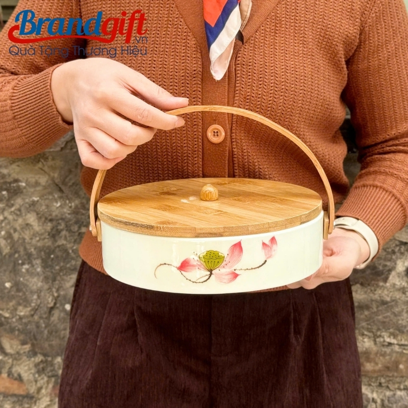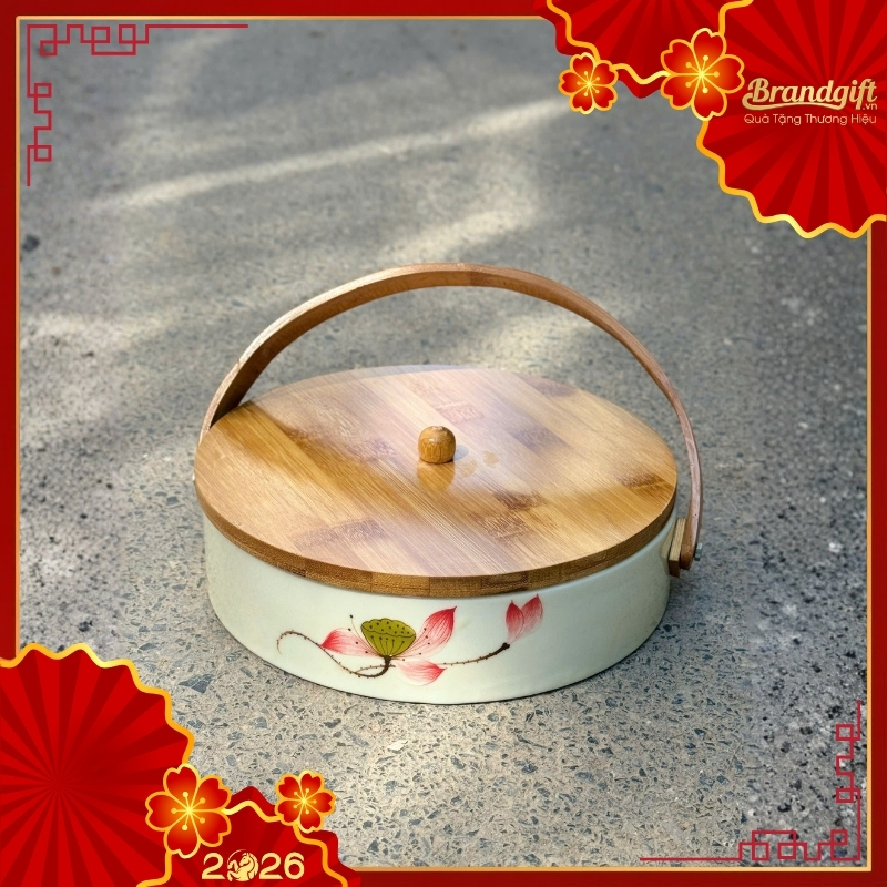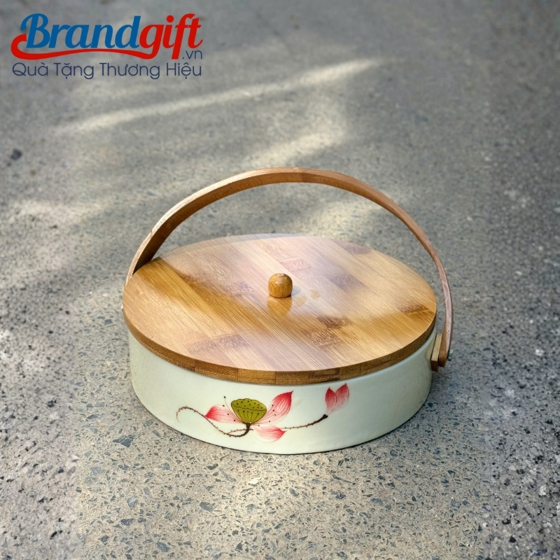 - Nắp đậy và tay xách được chế tác từ gỗ tự nhiên cao cấp. Sự kết hợp giữa gỗ và sứ tạo nên vẻ ngoài độc đáo, đồng thời tay xách giúp việc di chuyển khay mứt trở nên dễ dàng và trang trọng hơn.