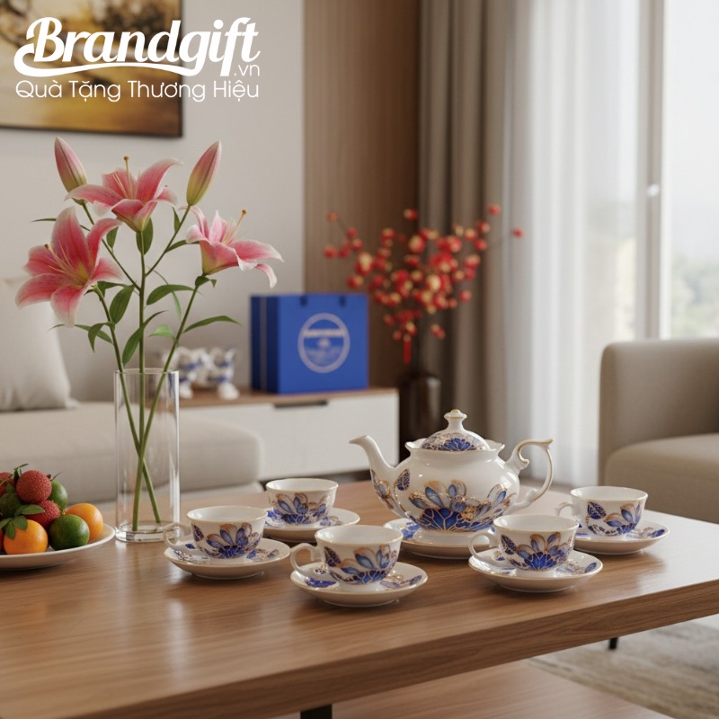 Bộ trà in logo làm quà tặng thể hiện sự tinh tế và đẳng cấp của doanh nghiệp. Brandgift kết hợp cùng hộp quà sang trọng, bộ ấm chén sẽ là đại sứ thương hiệu hoàn hảo, nâng tầm vị thế công ty bạn.